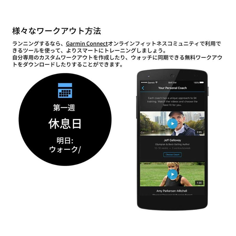 ◇Garmin Coachから無料のトレーニングプランを入手したり、当社のGarmin Connectオンラインフィットネスコミュニティで、自分専用のカスタムワークアウトを作ることができます。