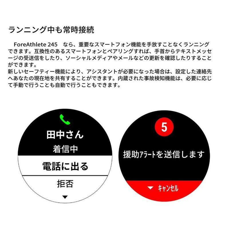 ForeAthlete 245 なら、重要なスマートフォン機能を手放すことなくランニングできます。互換性のあるスマートフォンとペアリングすれば、手首からテキストメッセージの受送信をしたり、ソーシャルメディアや電子メールなどの更新を確認したりすることができます。新しいセーフティー機能により、アシスタントが必要になった場合は、設定した連絡先へあなたの現在地を共有することができます。手内蔵された事故検知機能は、必要に応じて手動で行うことも自動で行うこともできます。