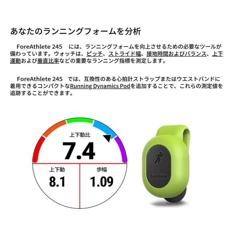 ForeAthlete 245 では、互換性のある心拍計ストラップまたはウエストバンドに着用できるコンパクトなRunning Dynamics Podを追加することで、これらの測定値を追跡することができます。
