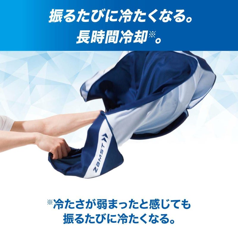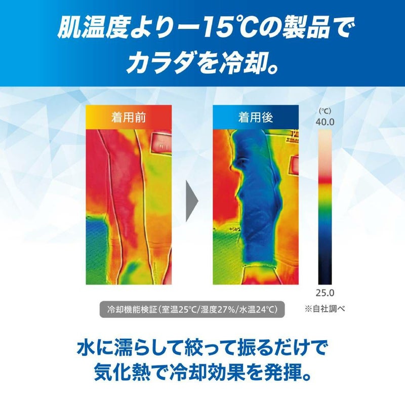 水に濡らして絞って振るだけで、気化熱で冷却効果を発揮します。生地温度が約15℃低下し、カラダの広い範囲を冷却します。