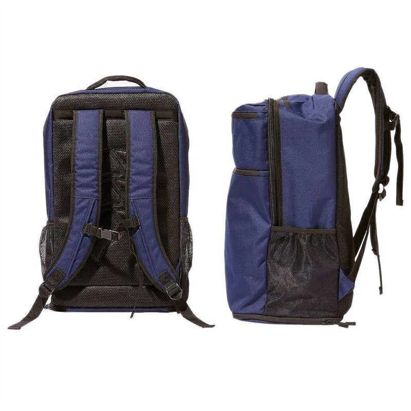フロントには立体的なポケットを2室に分けて配備、両サイドにメッシュ素材のボトルポケットを装備しています。
