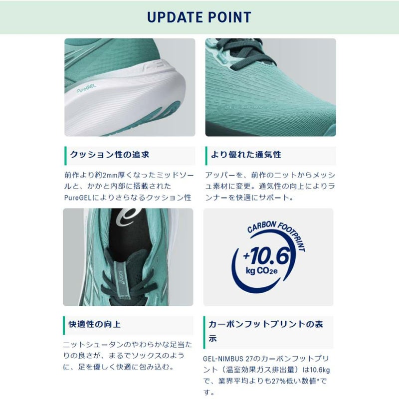 GEL-NIMBUS 27のやわらかいクッション性は、まるで雲の上に着地しているかのような感覚を提供します。ソフトなエンジニアードジャカードメッシュアッパーが足を快適に包み込み、すぐれた通気性を発揮。さらに、やわらかく足当たりの良いニットの履き口と伸縮性のあるニットシュータンにより、足に吸いつくようなフィット感を実現し、足を快適に包み込みます。ミッドソールにはFF BLAST PLUS ECOフォーム材を採用し、軽量でやわらかなクッション性を提供します。HYBRID ASICSGRIPアウターソールラバーが、優れたグリップ性と耐久性を提供します。