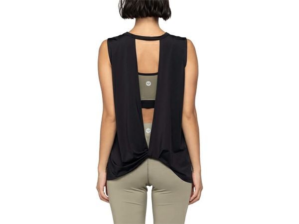 背中が大胆に見える、バックツイストデザインが特徴のタンクトップ。