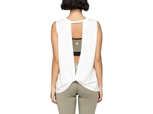 背中が大胆に見える、バックツイストデザインが特徴のタンクトップ。