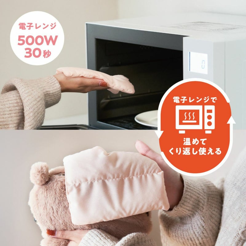 2.ビーズ袋を電子レンジ(500Wで30秒)で温め、ふんばるずウォーマーの背中に入れてください。