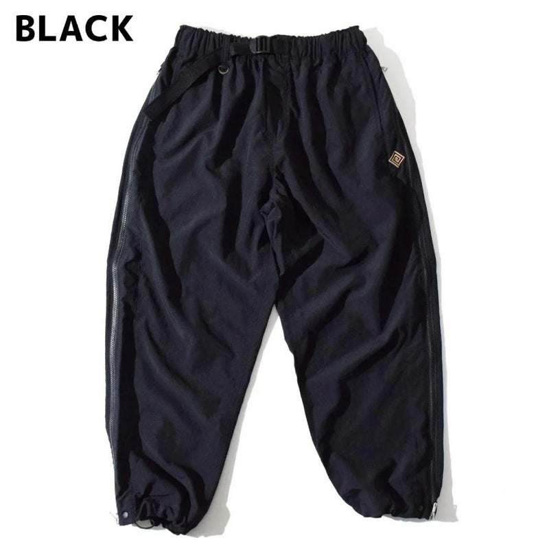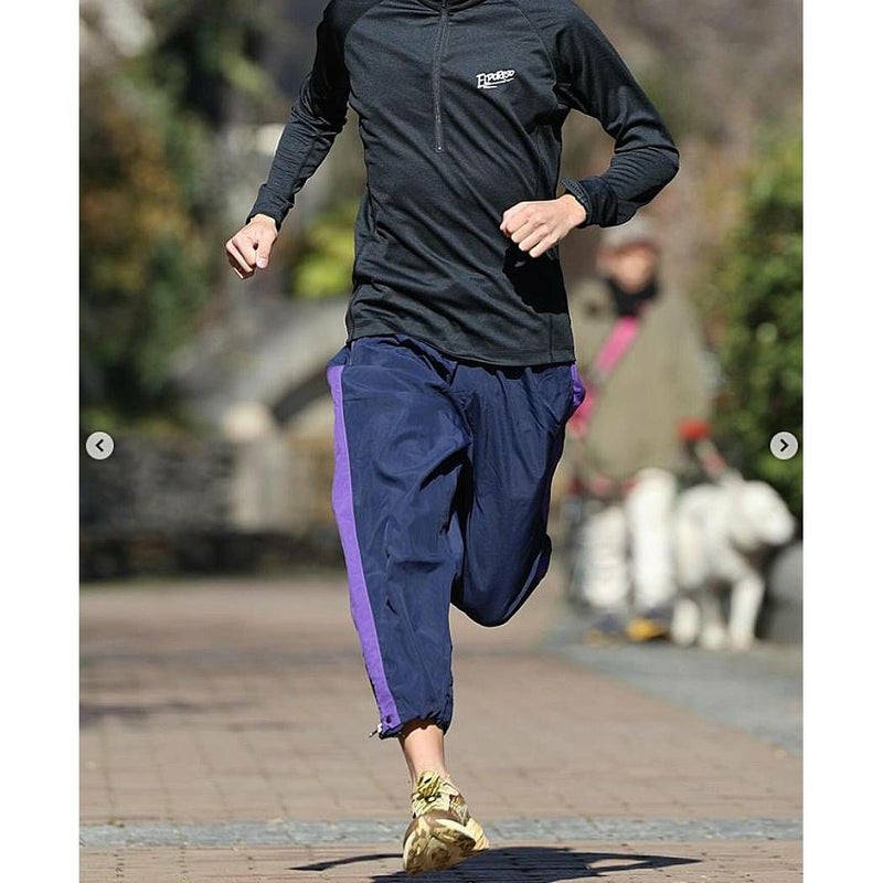 ELDORESOの秋冬の定番アイテム・パラシュートパンツから着想を得た、ランニングウェアとしては斬新なデザインの9.5分丈のランニングパンツです。