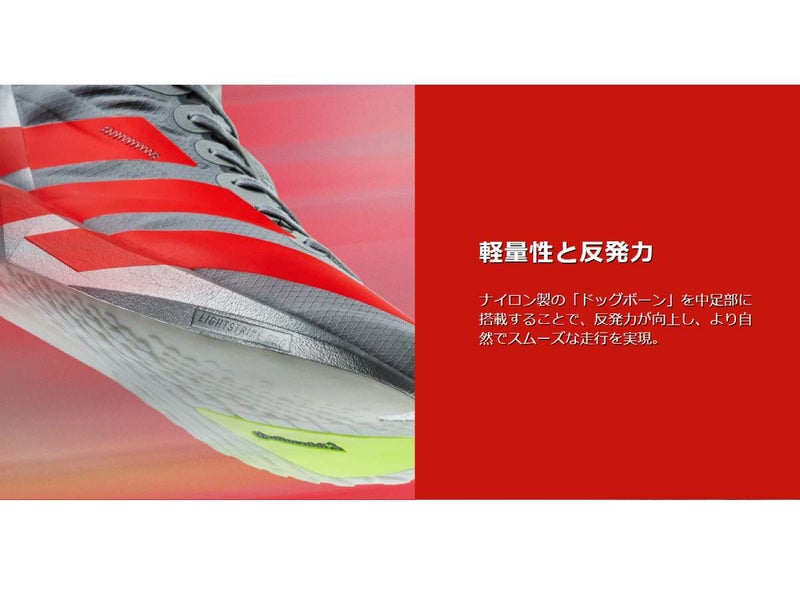 加速する感覚を足で掴みたいランナーへ。ゴールまでの距離は21キロ。このアディダスのランニングシューズで、記録を出そう。フルレングスのLightstrike Proミッドソールを搭載した、速さを重視した軽量シューズ。トレーニングランにも、レース当日の走りにも対応できる。ミッドソールに埋め込んだ小さな剛性エレメントが着地から蹴り出しまでの素早い重心移動をサポートする、快適な履き心地のストレッチメッシュアッパーを搭載したモデル。この製品には、リサイクル素材を20%以上使用。これまで作られてきた製品の素材をリユースすることで、廃棄物の量、限りある資源への依存、そしてアディダス製品のフットプリントの削減に役立てている。