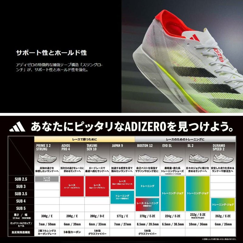 スピードを追求した作りのアディダス最新のアディゼロレース用シューズを履いて、自分史上最速の10kmを目指そう。