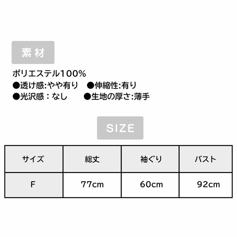 総丈:77cm、袖ぐり:60cm、バスト:92cm