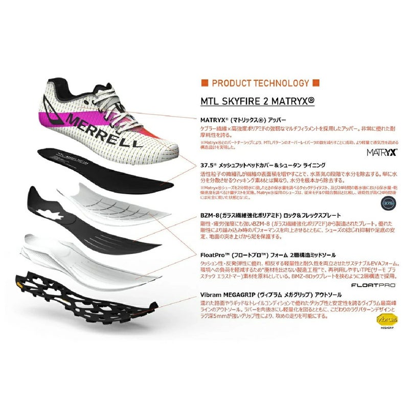 2022年に発売して以来定番モデルとして成長したオールラウンドモデル「MTL LONG SKY 2」のソールユニットをベースに、高い耐久性を誇る”MATRYX (マトリックス)”をアッパーに纏わせることで、ラギッドなフィールドコンディションでもアッパーの耐久性を気にすることなく、圧倒的な軽量性と通気性、グリップ力を際立たせ、よりアグレッシブな攻めの走りを実現させます。超軽量トップモデル「MTL SKYFIRE 2 MATRYXR / 約200g(27.0cm/片足)」と「MTL LONG SKY 2 / 約280g(27.0cm/片足)」 の中間的なウェイト”約240g(27.0cm/片足)”で設計された。