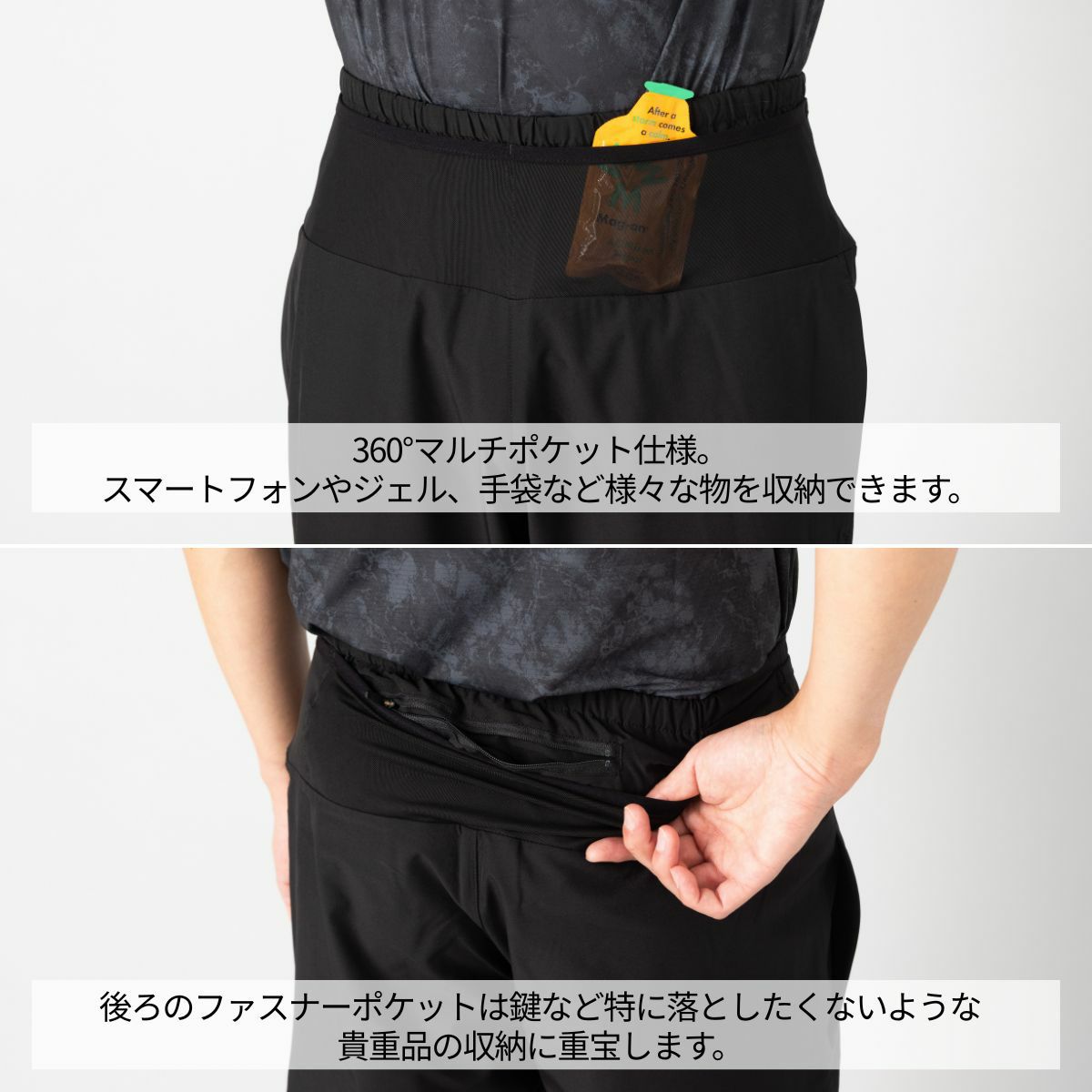 ランニング時の収納に便利な360°マルチポケット仕様。スマートフォンやジェル、手袋など様々な物を収納できます。