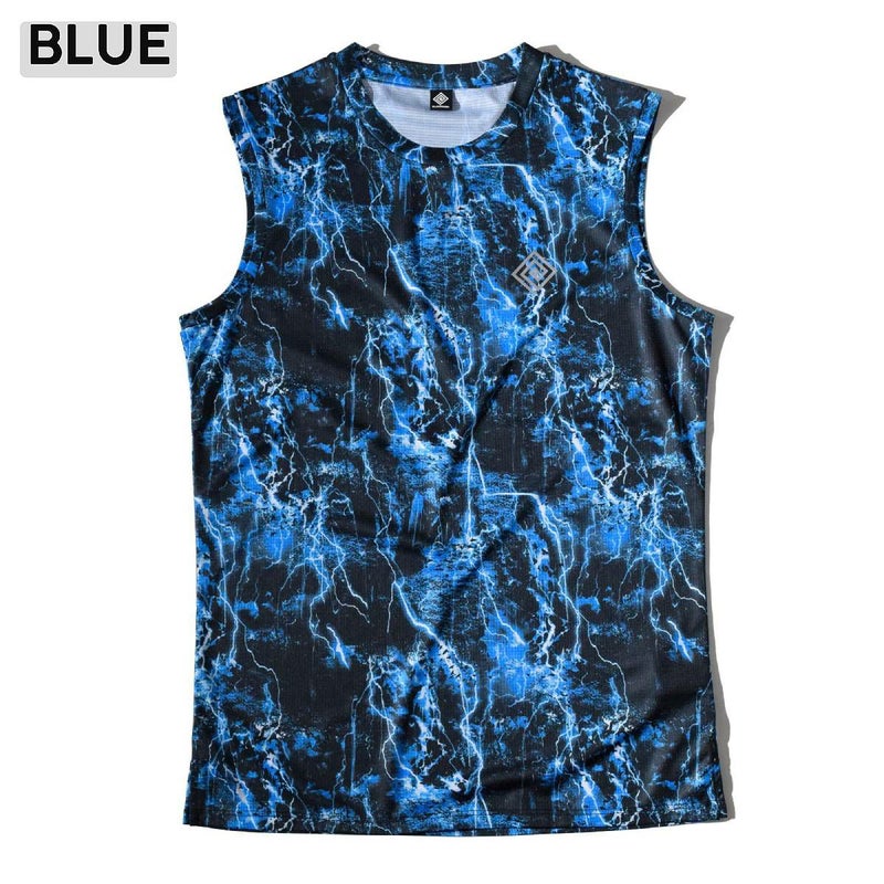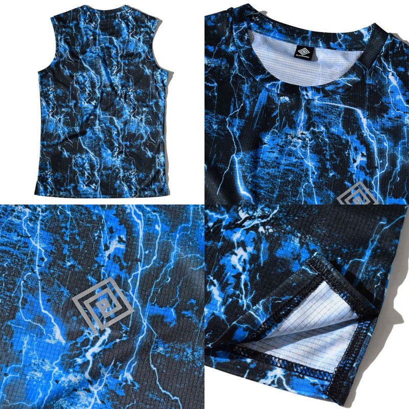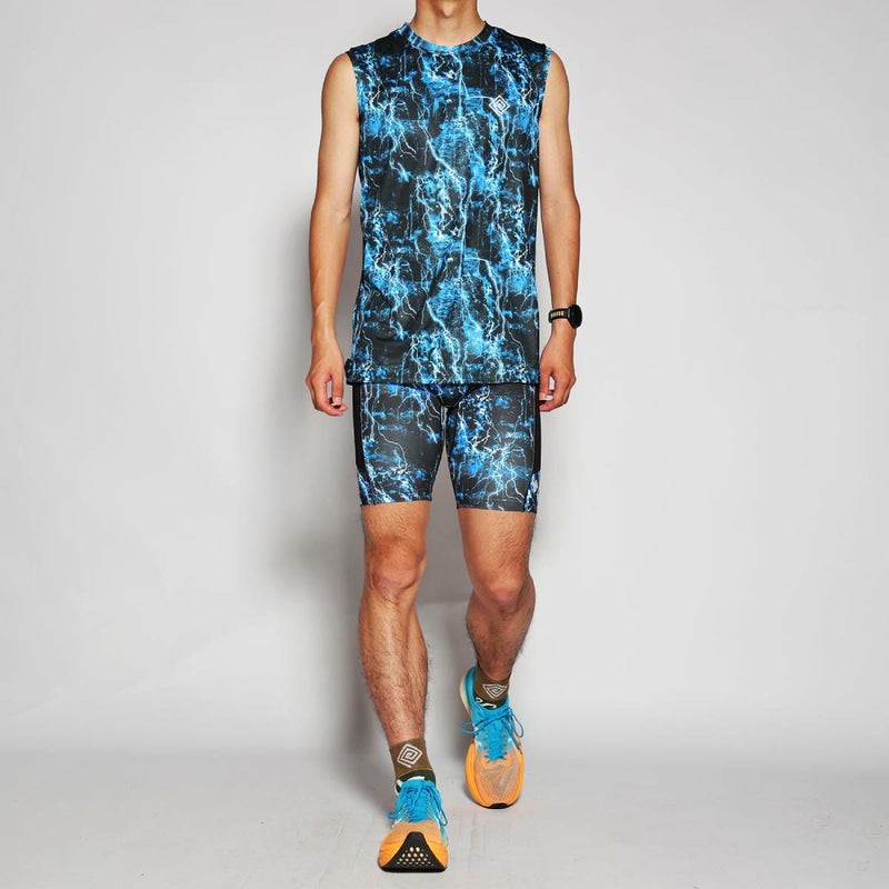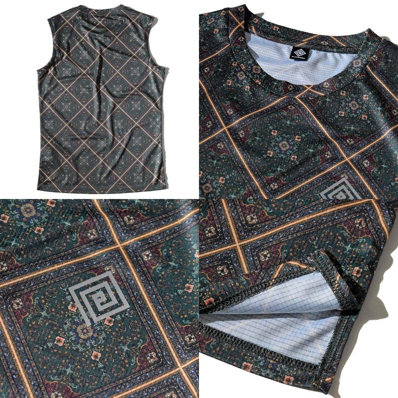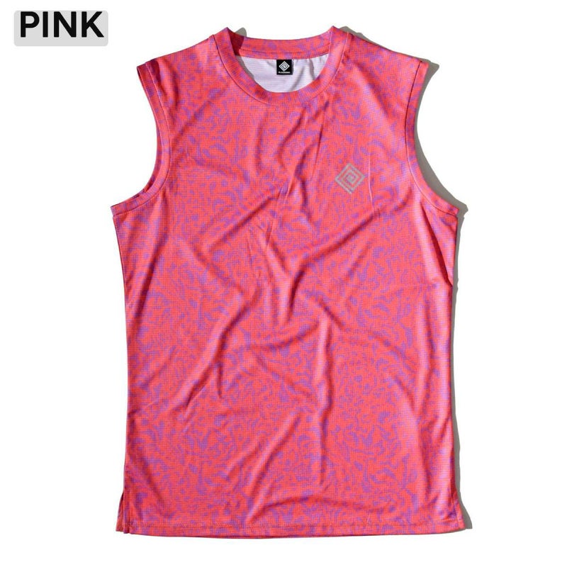 スポーツウェアで多用される昇華転写プリントによるデザインの可能性を最大限に活かすべく、緻密で色鮮やかなグラフィックを表現したオリジナルテキスタイルを使用したノースリーブのランニングシャツです。