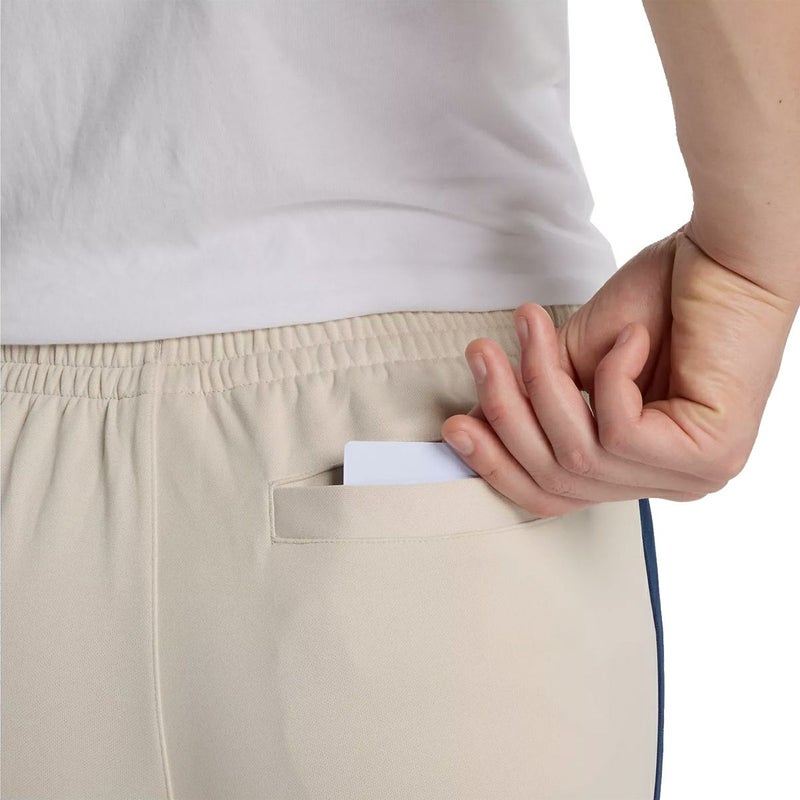 フロントのピンタック、左腿のNBロゴ刺繍、サイドラインテープが