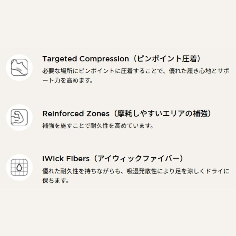 ・摩耗しやすい部分(つま先、親指、かかと、足首)にナイロン補強を施し耐久性を向上