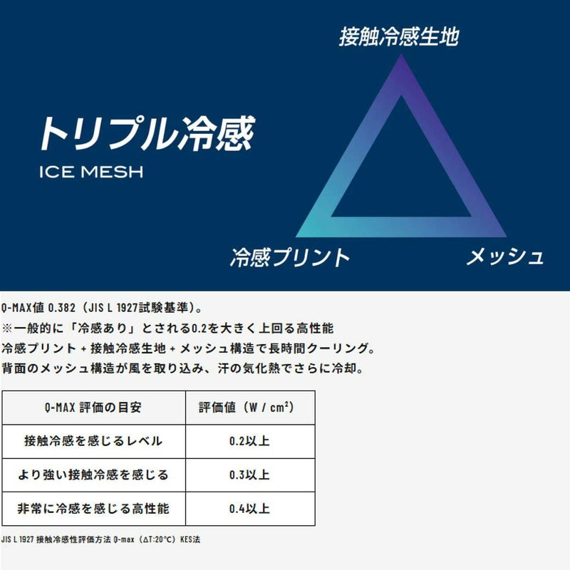 「接触冷感生地」「冷感プリント」「メッシュ構造」の3つの冷却技術を融合し、全身を包むクーリング効果を実現!汗や水分・風と反応する独自技術が、持続的な涼しさを提供します。