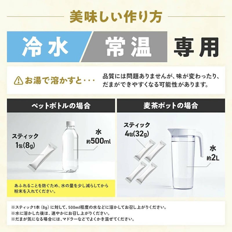 スティック1本(8g)に対して、500ml程度の水などに溶かしてお召し上がりください。