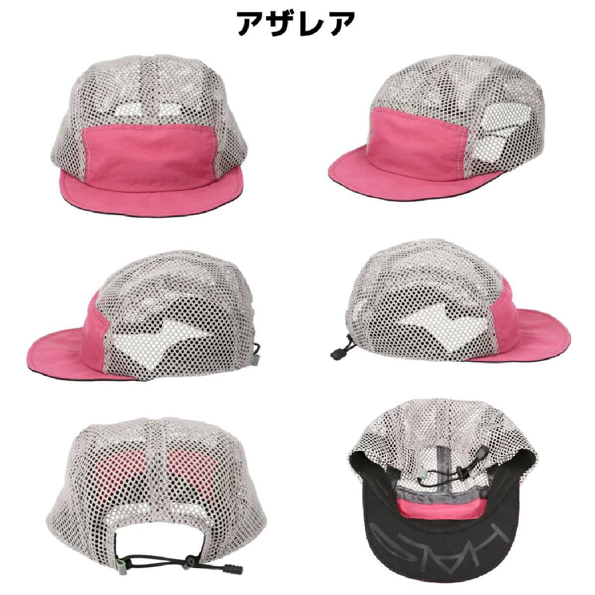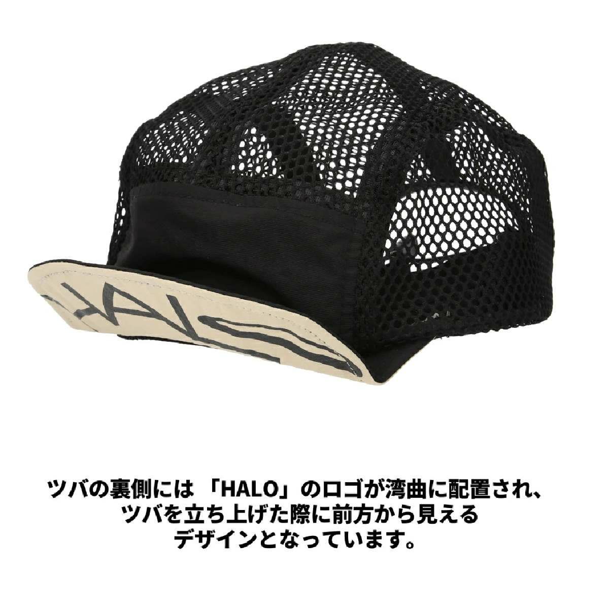 フロントパネル以外はメッシュでデザインされた「HALO trail」。メッシュのため汗抜けがよくアクティブシーンでも頭に熱がこもることなく快適に着用できます。「HALO hike」同様内側には汗止めシリコンゴムと、ツバに針金が施されています。ツバの裏側には 「HALO」のロゴが湾曲に配置され、ツバを立ち上げた際に前方から見えるデザインとなっています。後ろのコートを引っ張るたけて簡単にサイス調節か可能てす。