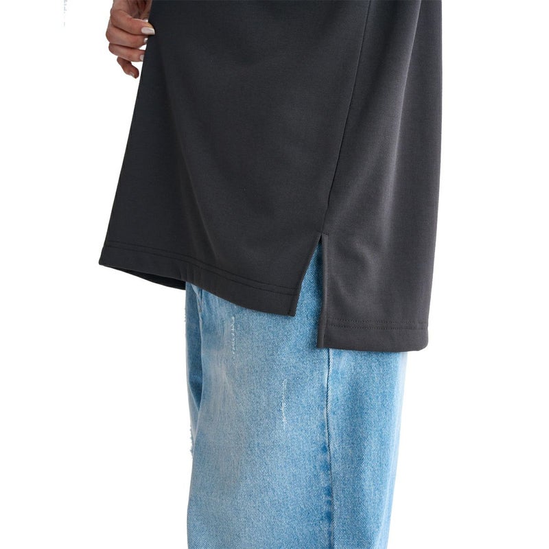 身幅広めのドロップショルダーで、袖丈は短めのシルエット。