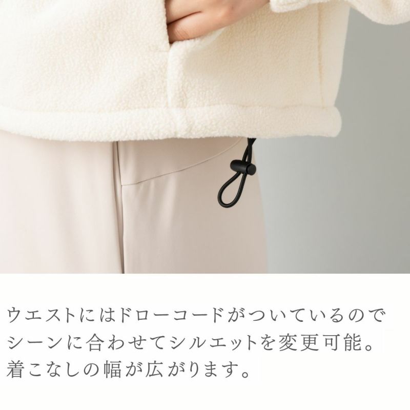 フリース素材なので、寒い時期の移動にピッタリです。ウエストにはドローコードがついているのでお好みでウエストや裾に丸みを持たせたシルエットや、丈を短く見せるなど、着こなしの幅が広がります。また、絞ることで冷たい空気の侵入を防ぎ、内側の暖かい空気を逃がしにくくします。少し短めの丈感なのでハイウエストのボトムスと合わせることで脚長効果も。・