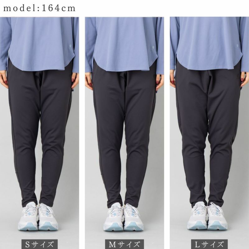 ストレッチ素材のテーパードシルエットのロングパンツ。