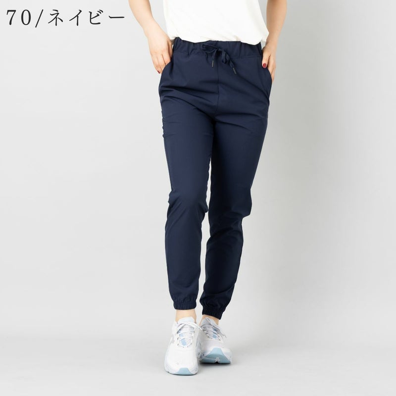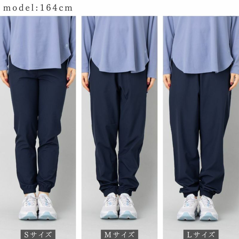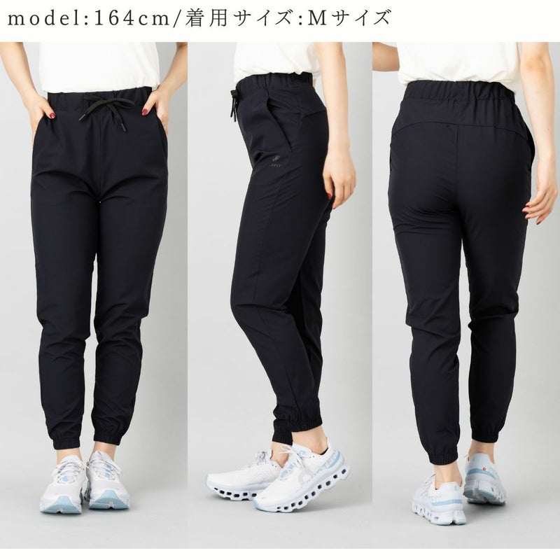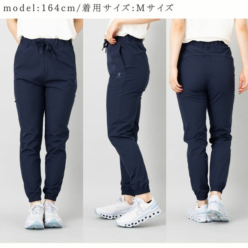 撥水、防風機能付きのテーパードシルエットのパンツで太もも周りには適度なゆとりがあり、脚のラインを拾いすぎず、すっきりとした印象で着用ができます。
