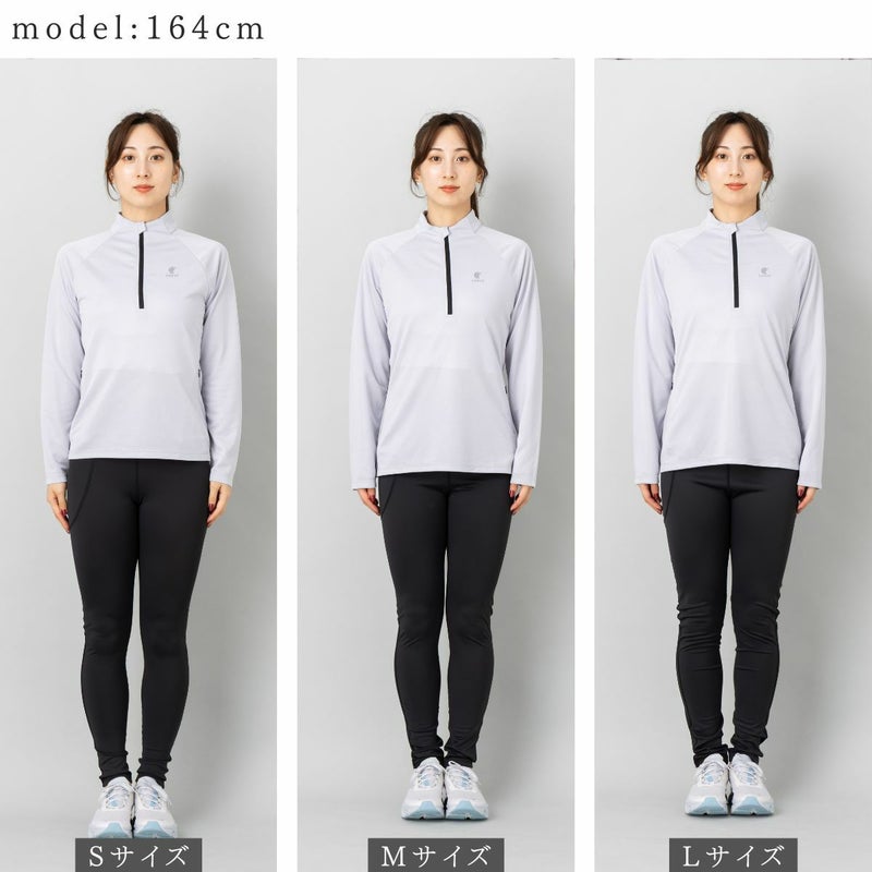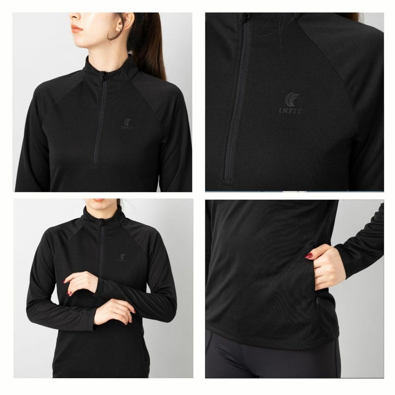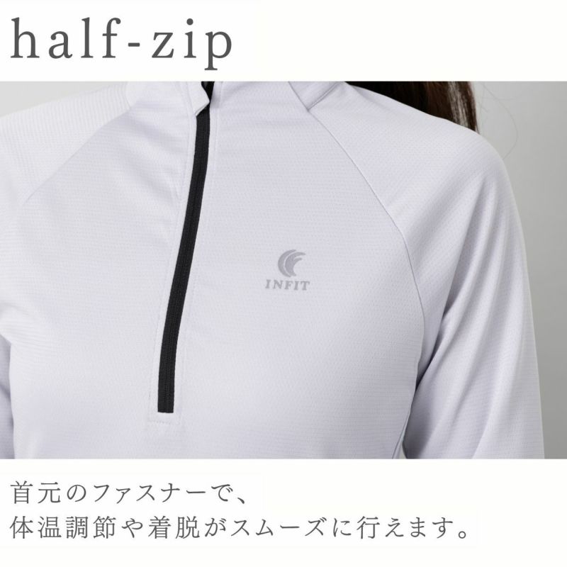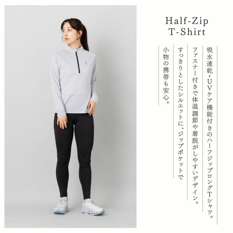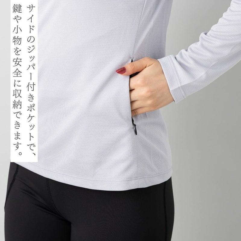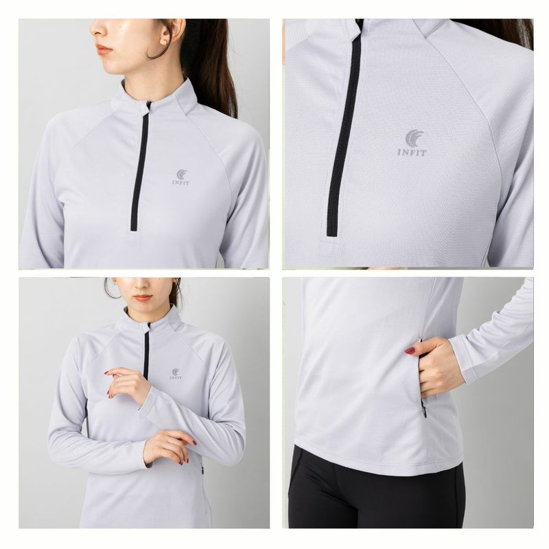 吸水速乾、UVケア機能付きのロングTシャツで首元にファスナーが付いており、体温調節や着脱のしやすさに優れています。