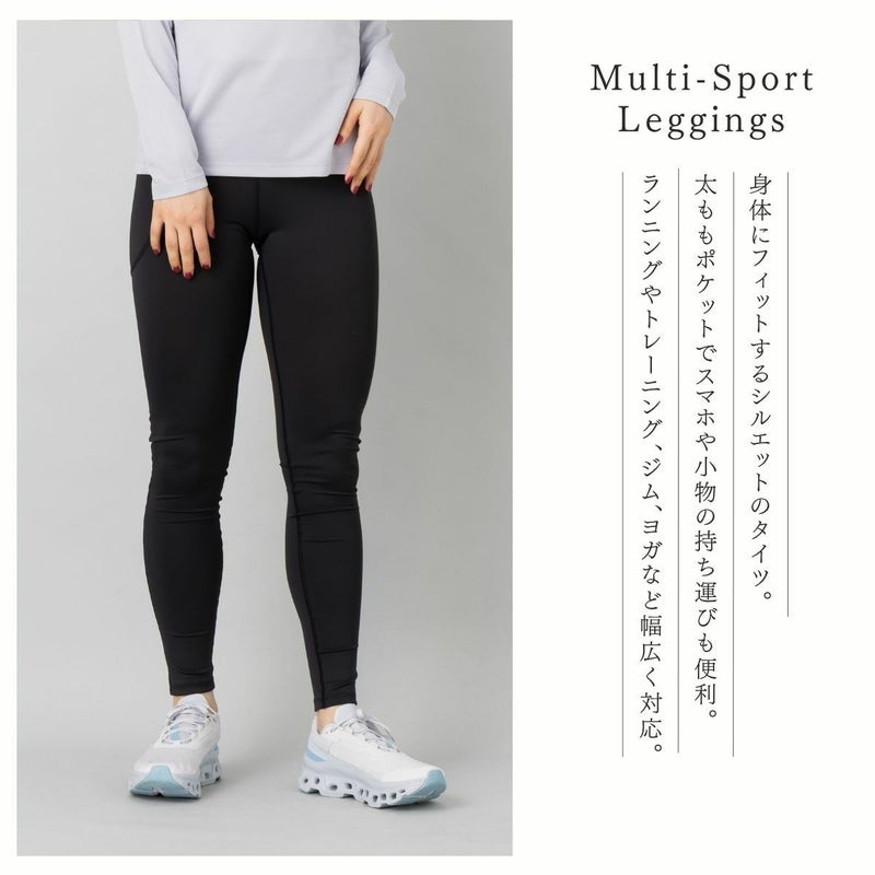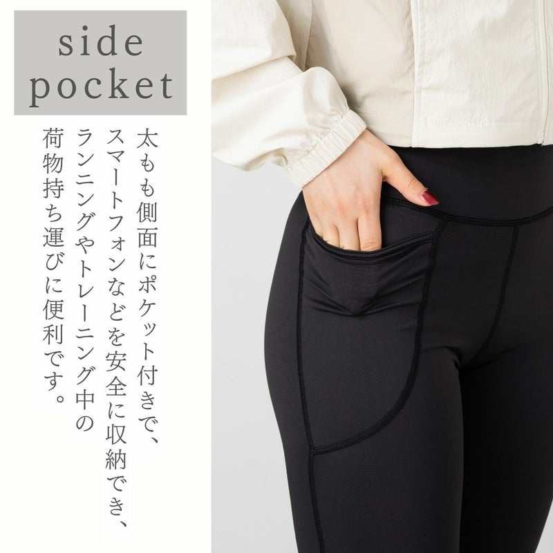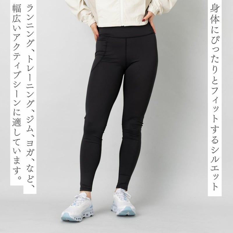 身体にぴったりとフィットするシルエットのタイツで、太ももの側面にスマートフォンなどを収納できるポケットが付いていてランニングやトレーニング中に荷物を持ち運びたいときにも便利です。ランニング、トレーニング、ジム、ヨガ、など、幅広いアクティブシーンに適しています。