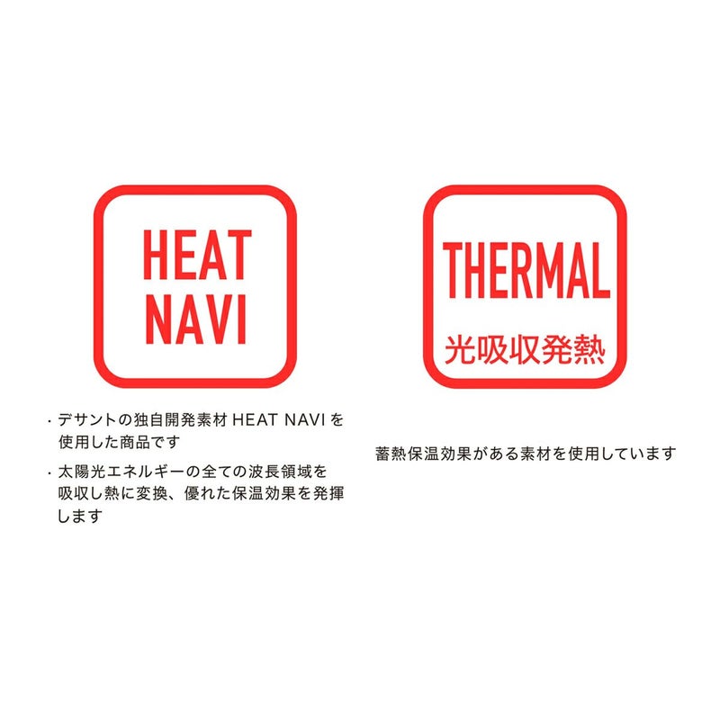 HEAT NAVI、TAIKYU、UV CUT(UPF50+)、ストレッチ、吸汗、光吸収発熱。
