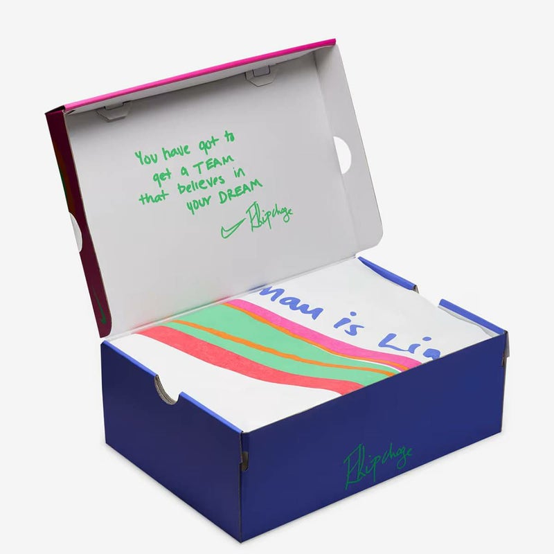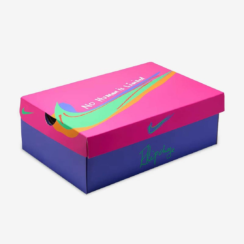 エリウド・キプチョゲは、一緒にトレーニングする人に必ず、成長を象徴するものとして彼のベースキャンプに木を植えてもらいます。 ソックライナーのグラフィックはその成長を模したデザインで、シューズのつま先に向かって伸びる枝をあしらっています。 レッドクレイのカラーグラデーションは、トレーニング中にシューズに付くケニアの土をイメージしています。 フォントは、表面がフラクタルのような模様を成すアフリカの木をヒントにしたデザインです。