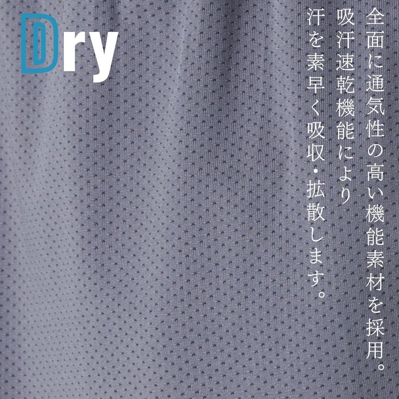 全面に通気性の高い機能素材を採用し、アクティブな動きの中でもムレを軽減。吸汗速乾機能により汗を素早く吸収・拡散し、ドライで快適な状態をキープします。