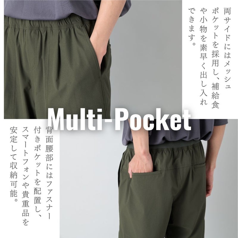 背面腰部にはファスナー付きポケットを配置し、スマートフォンや貴重品を安定して収納可能。さらにその両サイドにはメッシュポケットを採用し、補給食や小物を素早く出し入れできます。サイド部分にはコンシールファスナーポケットを備え、見た目をすっきり保ちながら収納力を確保しました。