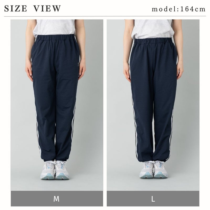 裾がゴムで絞られたシャーリング仕様になっており、足元がすっきり見えるデザインです。