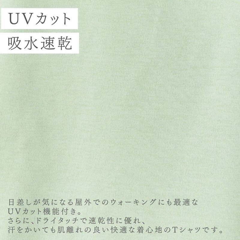 日差しの気になる屋外でのウォーキングにも最適なUVカット機能付き。さらにドライタッチで速乾性に優れているため、汗をかいても肌離れが良いTシャツです。