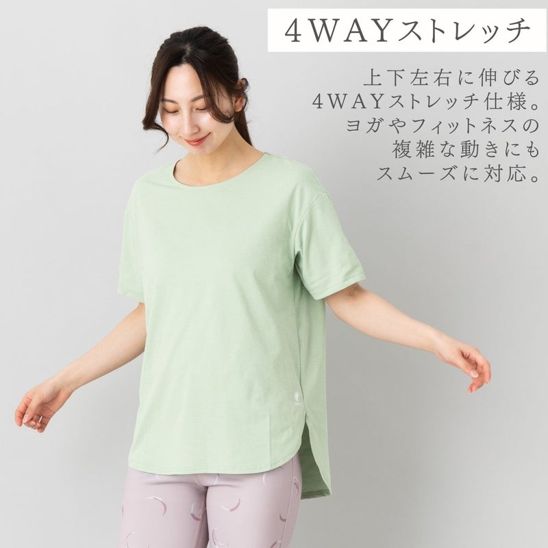 天竺編みの柔らかな質感ながら、上下左右に伸びる4WAYストレッチ仕様。ヨガやフィットネスの複雑な動きにもスムーズに対応。