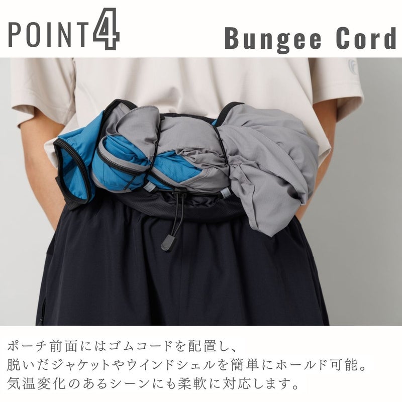 ポーチ前面にはゴムコードを配置し、脱いだジャケットやウインドシェルを簡単にホールド可能。気温変化のあるシーンにも柔軟に対応します。