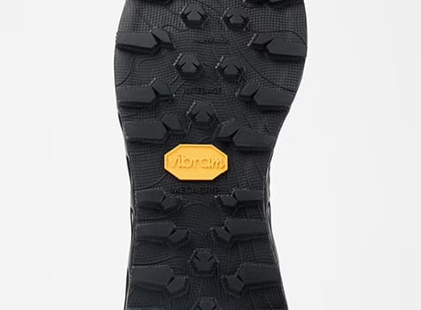 アウトソールには、信頼性の高いVibram®を採用。岩場や砂利道、湿った路面など、トレイル特有の不安定なコンディションでも安定したグリップ力を発揮します。路面状況の変化が多いトレイルでも、走りのリズムを崩しにくくサポートします。
