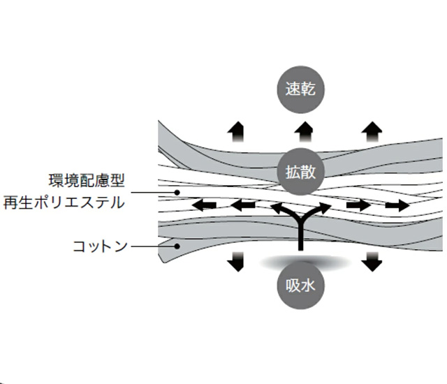 速乾性のある環境配慮型再生ポリエステルの周りをコットンで巻いた2層構造糸を使用。優れた吸水性で、運動中やトレーニング後の汗もしっかりキャッチ。ベタつきにくく、快適な使い心地が続きます。