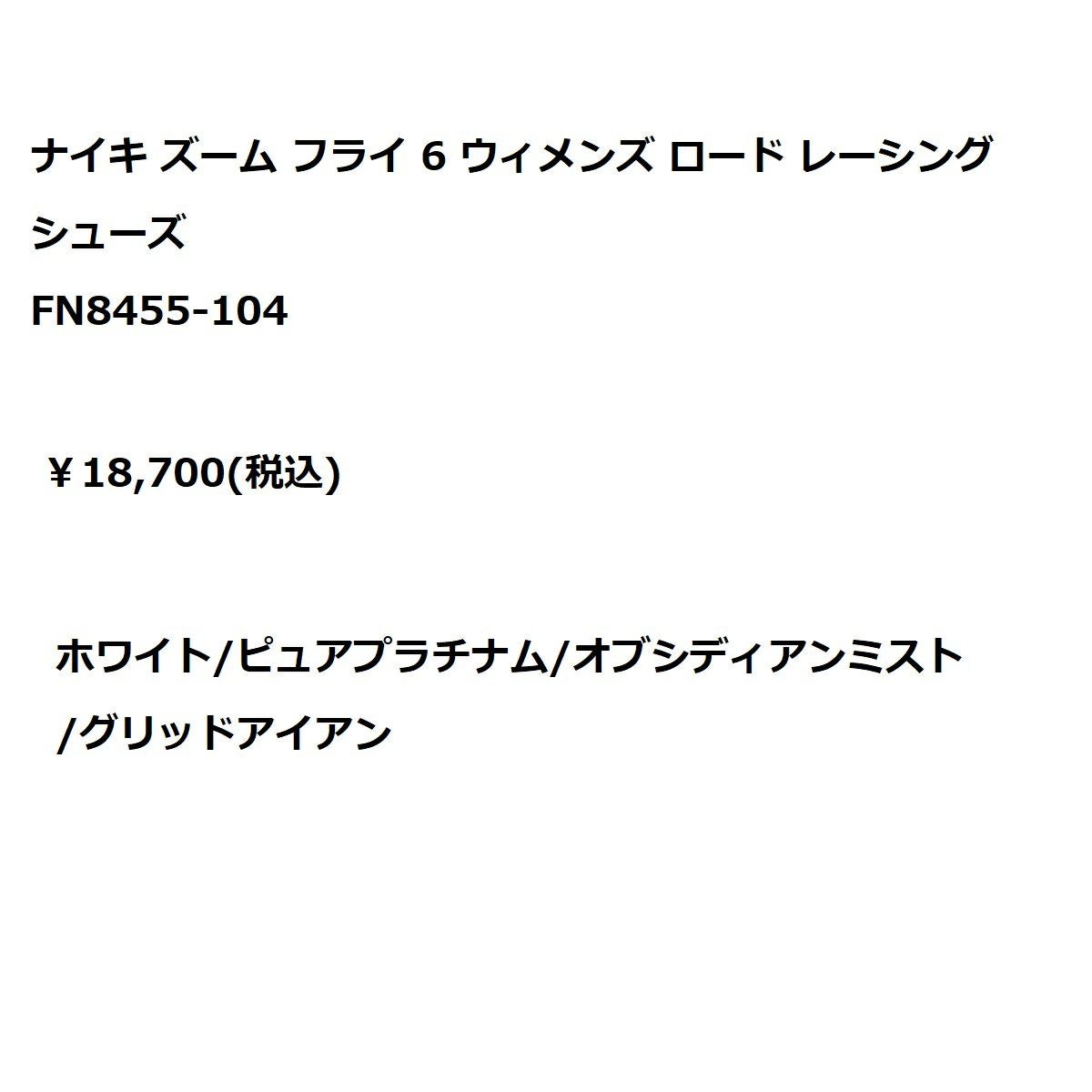 他の画像を見る 【20%OFF】スポーツ ランニングシューズ ランシュー ナイキ NIKE WS ズームフライ6 ロード レーシングシューズ スポーツ ランニングシューズ ランシュー FN8455104-104 メーカー希望小売価格 ¥ 18,700 販売価格 ¥ 14,960 税込 在庫を見る お気に入りに登録する