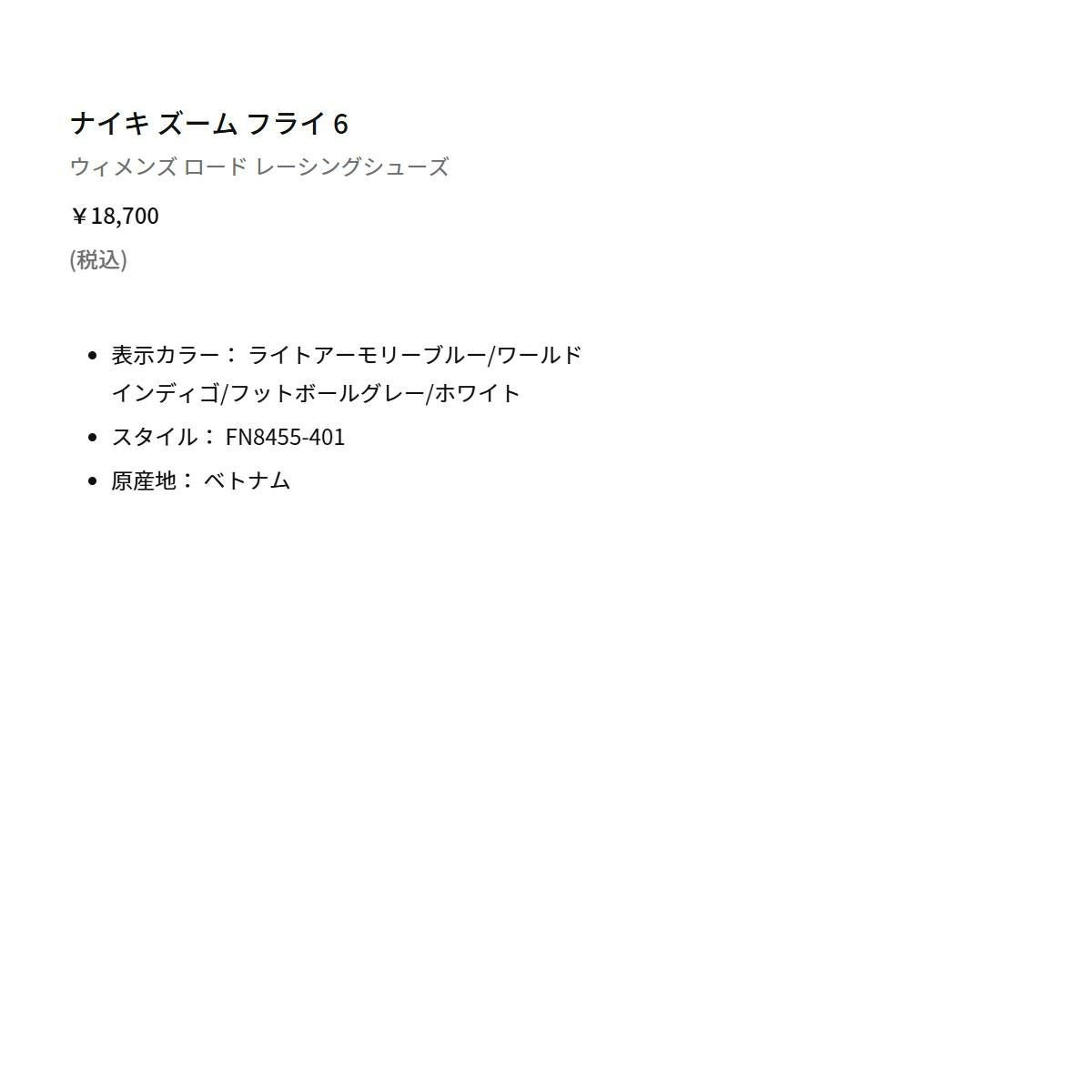 他の画像を見る 【10%OFF】スポーツ ランニングシューズ ランシュー ナイキ ズーム フライ 6 レディース NIKE ZOOM FLY 6 メーカー希望小売価格 ¥ 18,700 販売価格 ¥ 16,830 税込 在庫を見る お気に入りに登録する