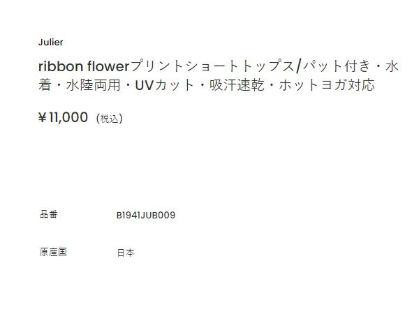 他の画像を見る スポーツ フィットネス ジュリエ Julier ribbon flowerプリントショートトップス パット付き レディース グリーン ブルー グレー 水着 水陸両用 吸汗速乾 ホットヨガ対応 日本製 スポーツ フィットネス ヨガ UVカット パット取り外し可能 ショート丈 B1941JUB009 メーカー希望小売価格 ¥ 11,000 販売価格 ¥ 11,000 税込 在庫を見る お気に入りに登録する