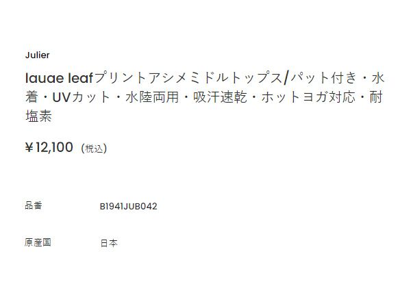 他の画像を見る スポーツ フィットネス スポーツブラ ジュリエ Julier lauae leafプリントショートトップス パット付き 水着 UVカット 水陸両用 吸汗速乾 ホットヨガ対応 耐塩素 スポーツ フィットネス スポーツブラ 伸縮性 イージーケア ストレッチ シック サップヨガ プール 海 ビーチ リゾート B1941JUB015 メーカー希望小売価格 ¥ 11,000 販売価格 ¥ 11,000 税込 在庫を見る お気に入りに登録する