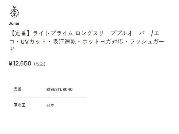 他の画像を見る スポーツ フィットネス ウェア ジュリエ Julier 定番 ライトプライムロングスリーブプルオーバー レディース エコ UVカット 吸汗速乾 ホットヨガ対応 ラッシュガード ホワイト ブラック 日本製 スポーツ フィットネス ウェア ラッシュガード ヨガ ヨガウェア ストレッチ素材 B1951TUB034 メーカー希望小売価格 ¥ 12,100 販売価格 ¥ 12,100 税込 在庫を見る お気に入りに登録する