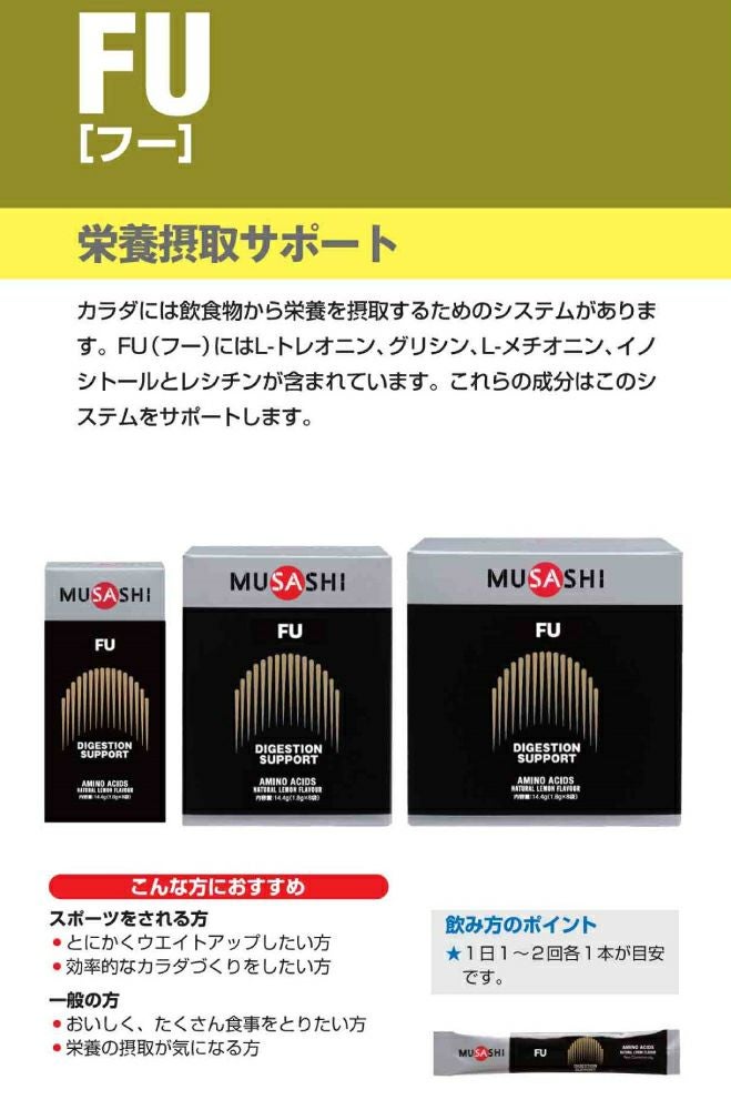 他の画像を見る スポーツ トレーニング アミノ酸 ムサシ MUSASHI FU フー 50本入り 1本(1.8g) アミノ酸 サプリ サプリメント 栄養の摂取 ウエイトアップ パワーアップ 人口甘味料不使用 日本製 スポーツ カラダ作り ウエイトコントロール アミノ酸 プロテイン・サプリ2点以上まとめ買い割引対象商品 メーカー希望小売価格 ¥ 5,616 販売価格 ¥ 5,616 税込 在庫を見る お気に入りに登録する