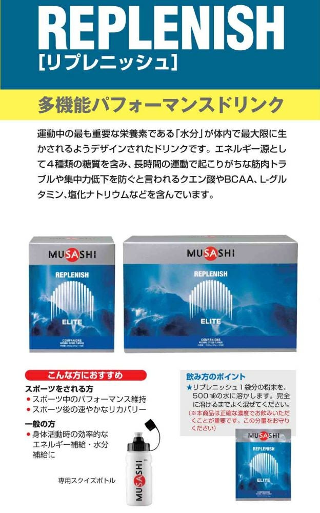 他の画像を見る スポーツ トレーニング サプリメント ムサシ MUSASHI REPLENISH リプレニッシュ 30袋入り 1袋(35g) アミノ酸 サプリ サプリメント 集中力低下 エネルギー補給 人口甘味料不使用 粉末清涼飲料 日本製 リカバリー パフォーマンス維持 多機能パフォーマンスドリンク 筋肉トラブル プロテイン・サプリ2点以上まとめ買い割引対象商品 メーカー希望小売価格 ¥ 6,156 販売価格 ¥ 6,156 税込 在庫を見る お気に入りに登録する